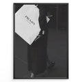 Fashion Plakat | Prada Shopping Bag Fashion Photography Wall Art Plakaty.dk | Black and white photo of a person holding a large Prada Milano shopping bag, dressed in elegant dark clothing.