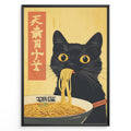 Japanske plakater | Illustration of a black cat eating ramen noodles from a bowl, in a Japanese art style with bold red kanji on a yellow background.