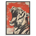 Plakater | Stylized illustration of a roaring tiger with an open mouth, black and cream colors on a textured red background, framed in black.