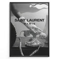 Fashion Plakat | Saint Laurent Glamour Art Featuring Glitter Phone and Elegant Hand Plakaty.dk | Black-and-white image of a sparkling vintage rotary phone being held by a glittering, elegant hand, with "SAINT LAURENT PARIS" overlaid in bold text.