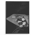 Fashion Plakat | Saint Laurent Paris – Monochrome Elegance Poster Plakaty.dk | Black and white Saint Laurent Paris poster featuring a bouquet of white roses wrapped in paper.
