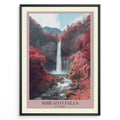 Load image into Gallery viewer, Japanske plakater | Scenic waterfall landscape featuring Shiraito Falls surrounded by red autumn foliage and mountains under a partly cloudy sky.