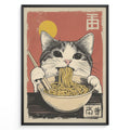 Japanske plakater | Vintage-style illustration of a tabby cat eating ramen noodles with chopsticks, set against a red background with a yellow sun and Japanese kanji.