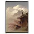 Japanske plakater | Traditional Japanese temple surrounded by cherry blossoms with Mount Fuji in the background, framed by dramatic clouds and mountain peaks under a soft, serene sky.