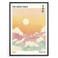 Load image into Gallery viewer, Japanske plakater | Pastel-style illustration of "The Great Wave" with large foamy waves under a warm orange and yellow sunset, inspired by Hokusai’s iconic woodblock print.