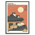 Load image into Gallery viewer, Japanske plakater | Illustration of five cats lounging on a Japanese-style tiled roof under a coral sunset sky with a full moon, styled like a modern Ukiyo-e poster labeled “Tokyo Japan” and “The Roof.”
