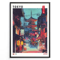 Load image into Gallery viewer, Japanske plakater | Illustrated poster of a night street scene in Tokyo with glowing lanterns, traditional Japanese shops, and a large illuminated pagoda in the background, styled in a neon, cyberpunk aesthetic.