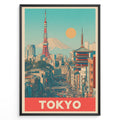 Load image into Gallery viewer, Japanske plakater | Retro-style poster of Tokyo cityscape with Tokyo Tower, a traditional pagoda, and Mount Fuji in the background under a yellow sun and turquoise sky.