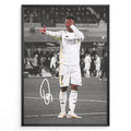 Framed plakat of Vinícius Jr. in a Real Madrid kit doing an eye-cover celebration, with a black and white background and printed signature