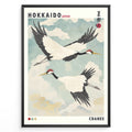 Load image into Gallery viewer, Japanske plakater | Vintage-style Japanese poster featuring two red-crowned cranes flying in a cloudy sky, with the text "Hokkaido Japan" and traditional Japanese characters referencing a summer festival.
