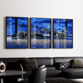 Load image into Gallery viewer, Triptych wall art plakat of the Williams Racing FW46 Formula 1 car with a bold blue background, displayed in a contemporary living room with black leather furniture.
