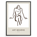 Framed Art Bohème poster with minimalist abstract nude line drawing in brown on a white and beige background.