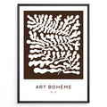 Framed Art Bohème poster showing abstract white leaf patterns on a dark brown background with minimalist text at the bottom.