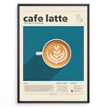 Cafe latte art print plakat showing a top-view coffee cup with latte foam art on a blue background framed in black.