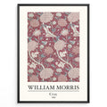 Framed William Morris Cray 1884 art print plakat with intricate red floral and leaf design accented by cream and pale blue tones.