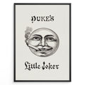 Framed Duke’s Little Joker vintage poster with detailed moon face illustration smoking a cigarette on a beige textured background.