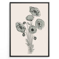 Framed minimalist floral line art poster with black poppy flowers and soft gray shading on a light beige background.