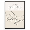 Framed Galerie Bohème poster featuring minimalist black line art of two hands holding each other on a beige and white background.