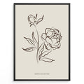 Framed Jardin Collection poster featuring brown line art of blooming peony flowers and leaves on a beige background in a minimalist style.