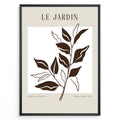 Framed minimalist poster titled “Le Jardin” featuring brown botanical leaf line art on a soft beige and white background.