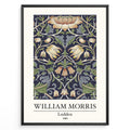 Framed William Morris Lodden 1889 art print plakat with ornate floral motifs in navy blue, gold, and green tones.