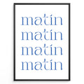 Minimalist French typography poster with the word “matin” repeated four times in blue text on a white background in a white frame.