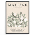 Framed Matisse-style botanical poster with abstract green and white leaf cutout shapes and beige background, titled “Papiers Découpés.”