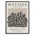 Framed Matisse Papiers Découpés poster featuring black botanical cut-out shapes on a taupe background.