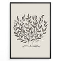 Framed minimalist botanical poster with abstract hand-drawn leaves in brown and black tones on a light beige background.