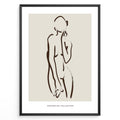 Framed minimalist poster featuring abstract brown line art of a female silhouette on a beige background with “Minimalist Collection” text.