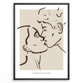 Minimalist line art of a couple kissing in a modern black frame on beige background.