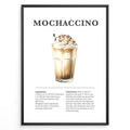 Mochaccino coffee recipe illustration with espresso, chocolate syrup, steamed milk, milk foam, and whipped cream.