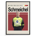 Peter Schmeichel fodbold plakat i klassisk grøn målmandstrøje fra Danmark landshold med stilrent rødt baggrundsdesign.