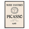 Framed Picasso Musée d’Antibes 1948 exhibition poster with a minimalist face illustration and vintage typography on a beige background.