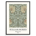 William Morris Pimpernel 1876 vintage floral art print plakat with green leaves and orange flowers in black frame.