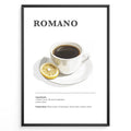 Load image into Gallery viewer, Minimalist Romano coffee recipe illustration with a cup of espresso and a lemon slice.