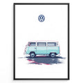Load image into Gallery viewer, Illustration of a teal vintage Volkswagen camper van side view on a minimal white background.