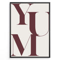 Minimalist typography wall art print plakat with the word “YUM” in large maroon letters on a cream background framed in black.
